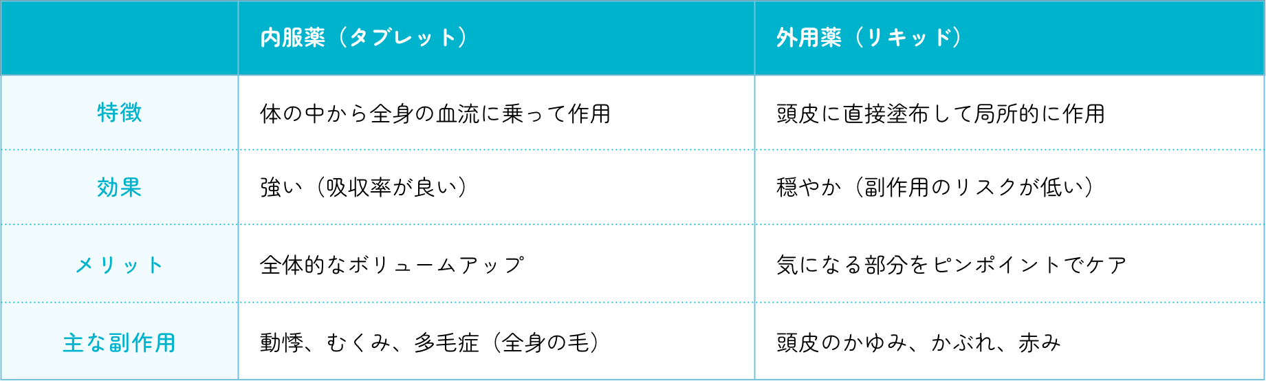 十分満足できる効果が得られた場合には、毛量維持のためにタブレットまたはリキッドのどちらかだけでも継続することをお勧めします。 -